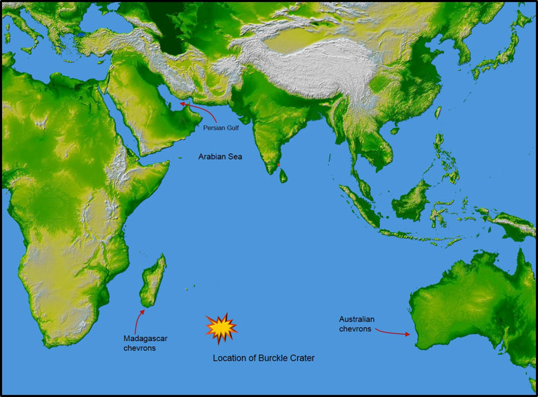 "the finding of impact ejecta in deep sea core samples containing meteorite fragments, impact glass and spherules as well as mantle fragments, all found in the vicinity of what appears to be a large, 16 mile in diameter crater-like structure is powerful evidence that a great meteor did indeed crash into the Indian Ocean. A 16 mile in diameter crater on the ocean bottom beneath 10,000 feet of water would require a meteor, or bolide, at least a mile in diameter moving at something like 20 miles per second when it struck. There is absolutely no question that an oceanic impact of that magnitude would generate very large tsunami waves." (See Abbott, Dallas H. et el. Abstracts for 2006 Philadelphia Annual Meeting G.S.A. 22 – 25 October, Paper No. 119-20. Impact Craters as Sources of Megatsunami Generated Chevron Dunes)"