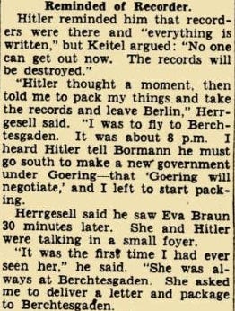 On several occasions in mid-May of ‘45, US Army Intelligence trotted Herrgesell out, at press conferences to dish juicy details about Hitler’s ‘last days’. For example, on May 18, Herrgesell told the gathered press corps about the last Fuehrer conference that he attended on April 22, 1945, saying Hitler proclamed, ‘I’m going to stay in Berlin. I won’t desert now. I will fall here before the Chancellery’ and emphasized that Hitler repeated these points at least ten times, [note that on April 22, hours before I think he fled Berlin, Hitler repeatedly made the point that he would not be leaving Berlin - ten times or more - for effect] followed by those present pleading with Hitler to ‘recant and agree to leave’. When one examines the Herrgesell appearances at press conferences from May 15-22, a clear picture emerges: Despite the fact that Herrgesell and his fellow stenographer departed Belin in the earliest morning hours of April 23, 1945, he was consistently painting a picture of Hitler’s suicide, as if he knew about it firsthand.