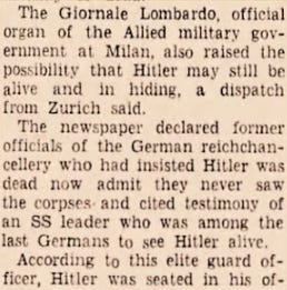 “Notice Herrgesell’s telling phrase at the end about Eva Braun. This match establishes Herrgesell and his Reich Chancellery stenographers as the officers quoted in the Giornale Lombardo article of June 6, 1945. Herrgesell was obviously involved in an interrogation of an unnamed elite SS guard who was with Hitler in Berlin in the end. What this man said during the interrogation forced Herrgesell and his colleagues to admit they hadn’t seen Hitler’s dead body because they hadn’t been in Berlin at the time of the supposed suicide. It was obviously the testimony of this unnamed ‘SS leader’ that made them change their tune.”