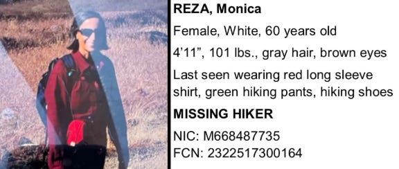 Memorial ID 284387277. Monica Jacinto Reza. Born December 30, 1964. Died June 22, 2025. Death location: Angeles National Forest, Los Angeles County, California, USA. Remains: Green burial… [This] was added while helicopters were still in the air looking for her.